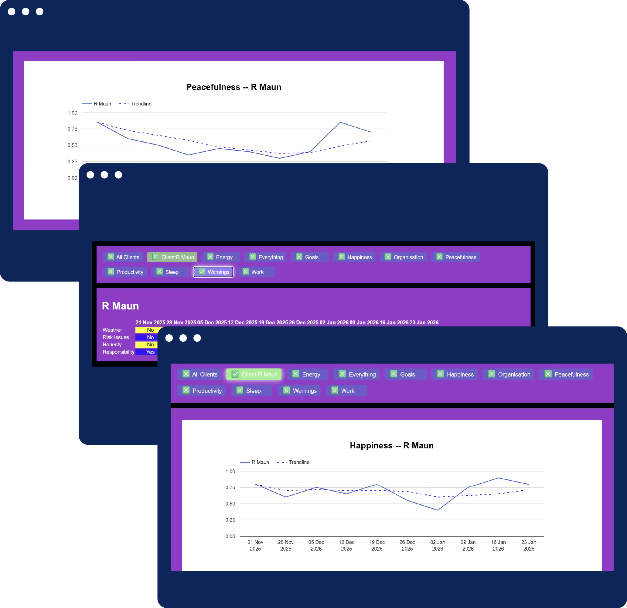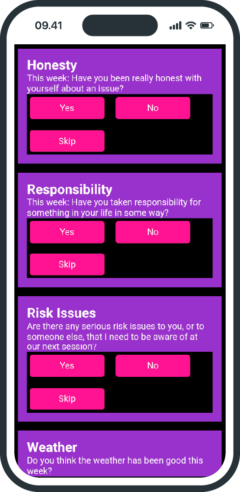 We email your clients with the Mindful Friihday survey each week. They follow the link and push buttons to score themselves for key health indicators, such as sleep, stress, productivity, healthy diet and progress towards therapy goals. It’s simple and safe and encourages reflection.